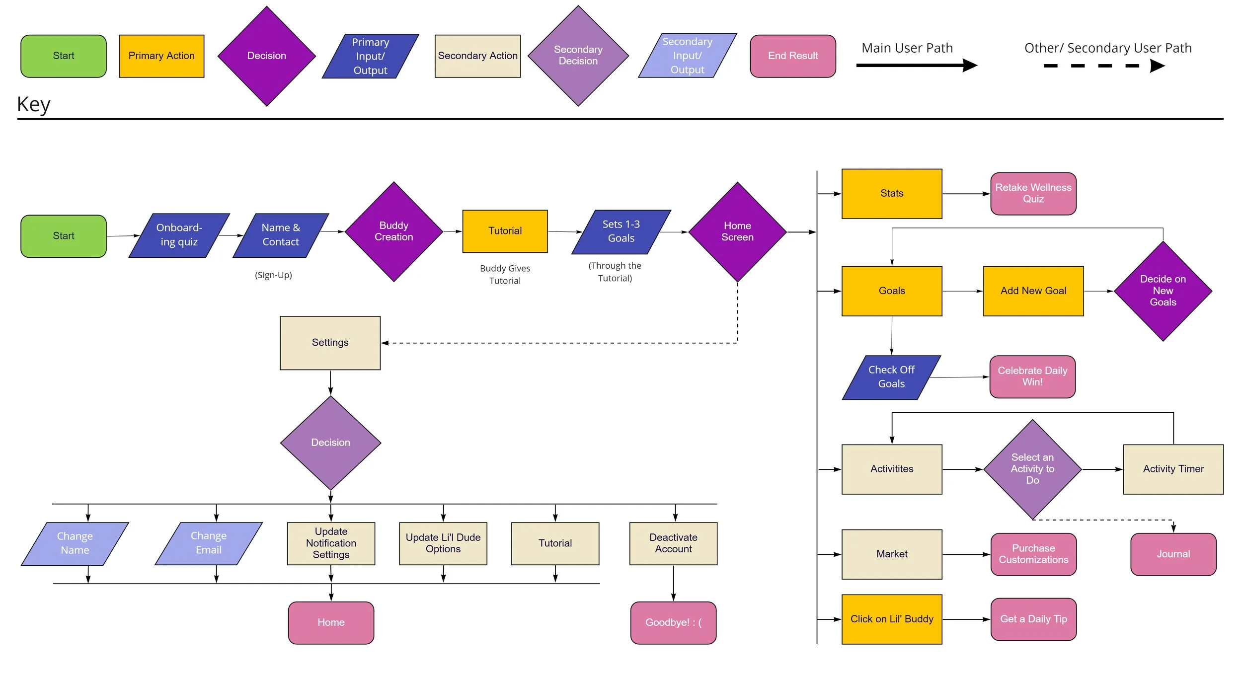 After our eureka moment, we were able to solidify our user flow. This shows pathways users can take for viewing their settings, statistics, goals, activities, and the marketplace.