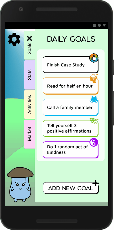 Our team is creating an app to help young adults create self-care habits. We are better than the other apps by gamifying our experience, by focusing on a holistic approach to your wellness, and by breaking through the bubble baths and face masks self-care trope. We know how easy it is to do good for others while overlooking ourselves. We are using this insight as our central theme giving users a little friend that they will care for as they care for themselves